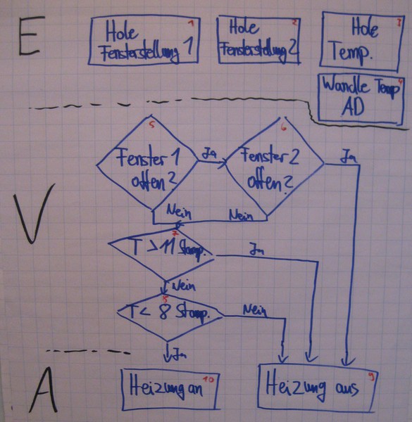 Die Karten (Befehle) sind durchnummeriert. Das Leitwerk spielt den Program Counter in dem es die auszuführenden Befehlsnummern hochhält. Der BUS holt den Befehl beim ROM ab und bringt ihn zum Rechenwerk. Input-Register und AD Wandler liefern die Input Werte, auf denen das Rechenwerk die Entscheidung für den nächsten Befehl macht, solange bis das SW Programm beendet ist.